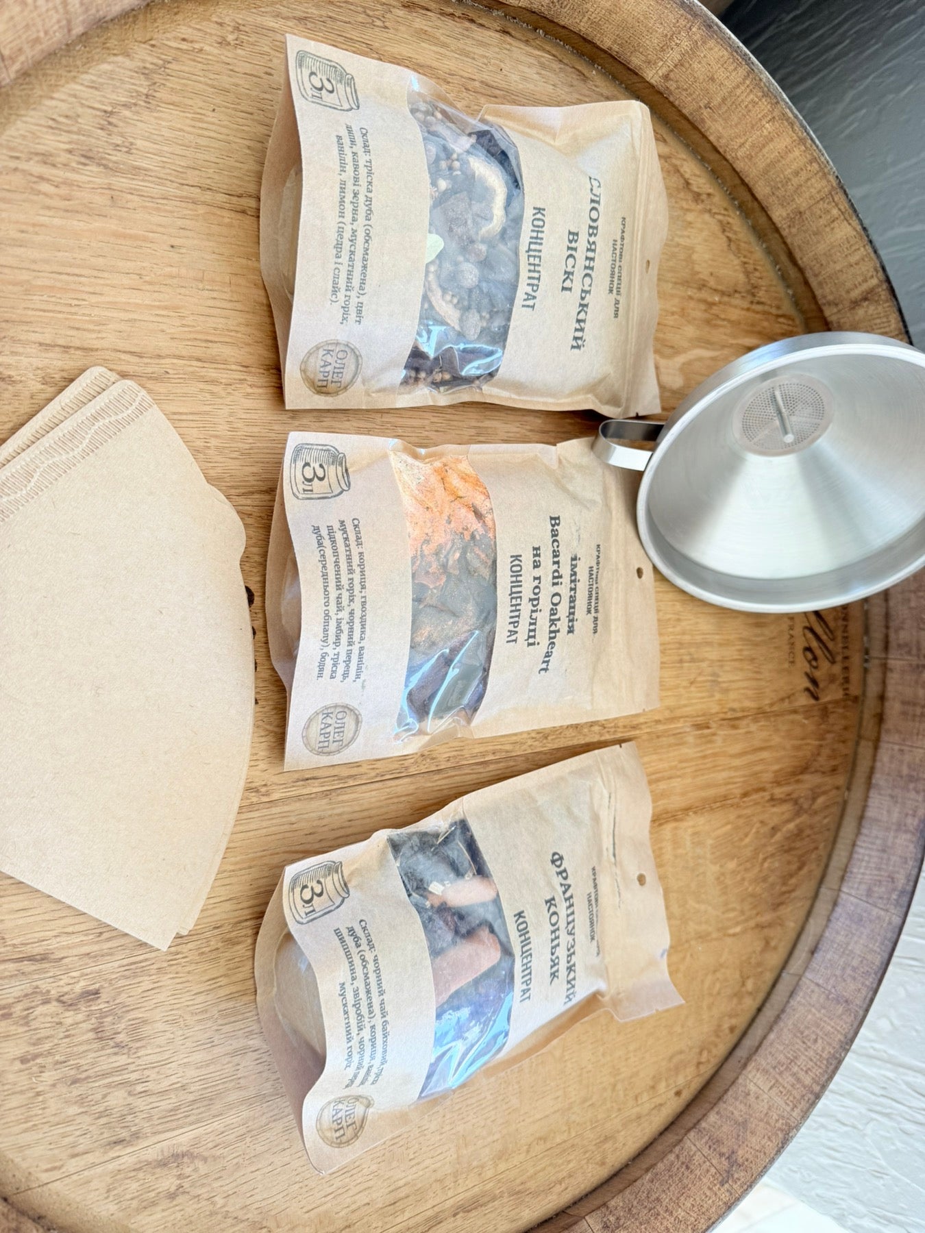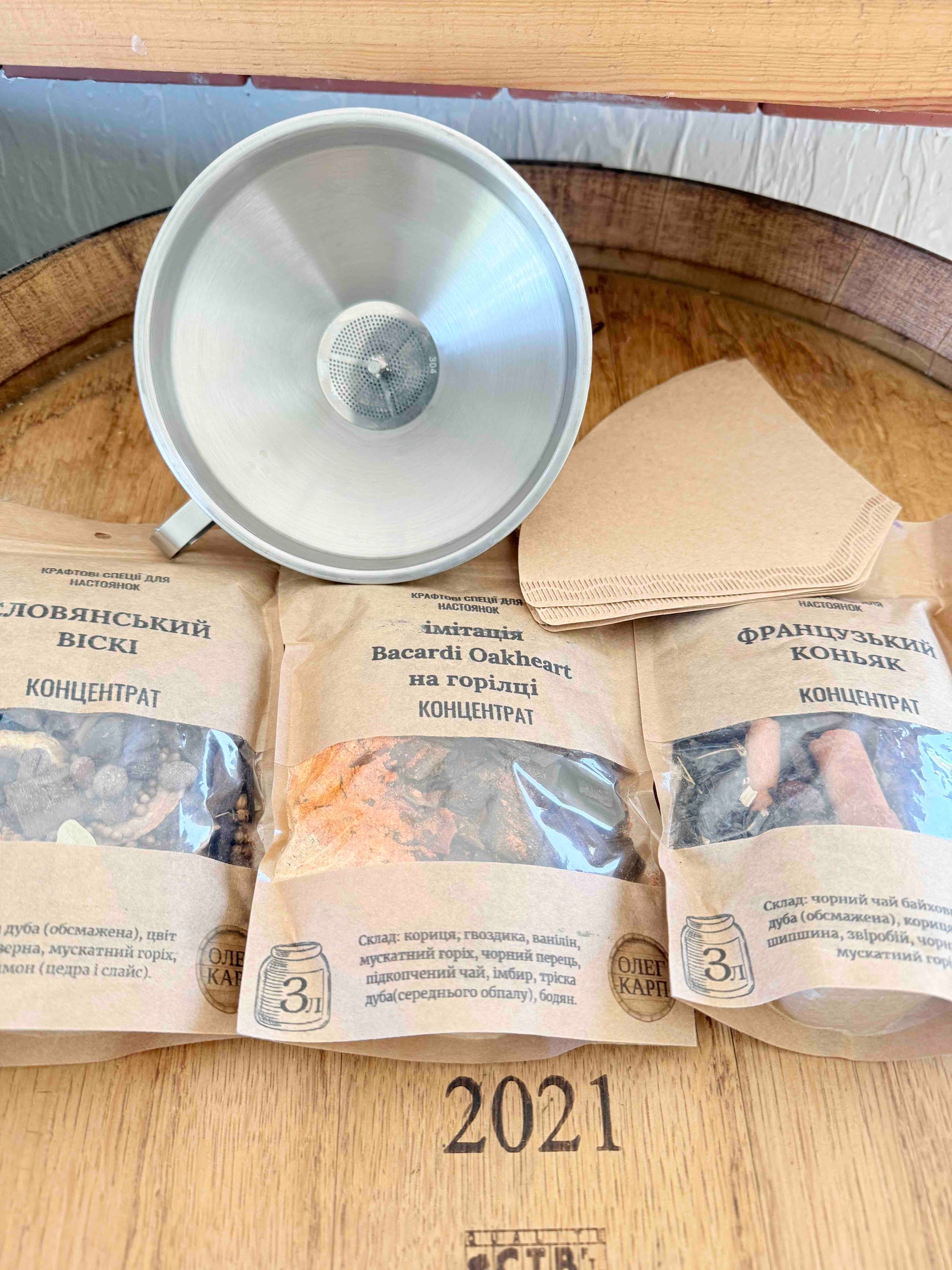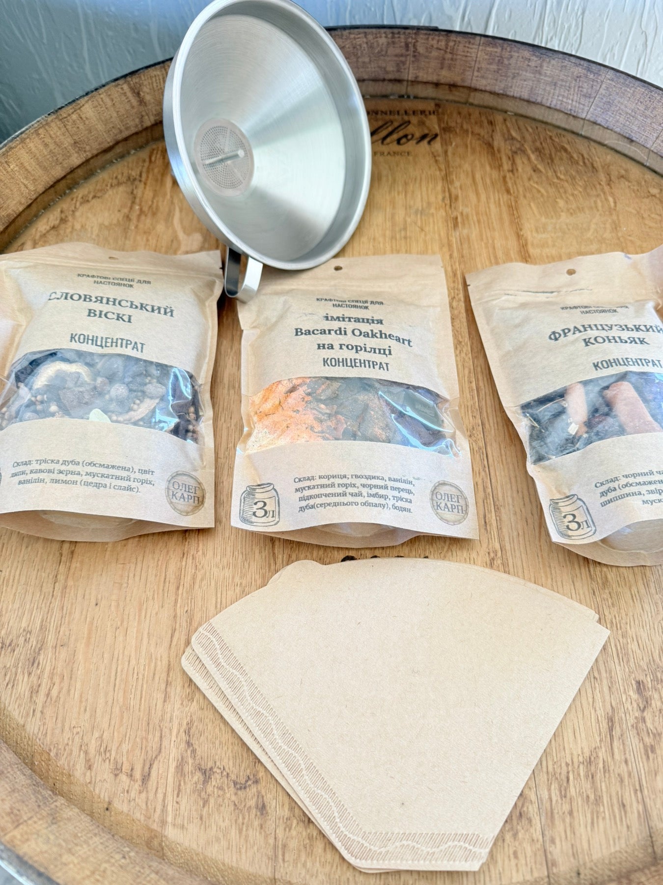 Швидкий старт настоянок без довгих підготовок: 3 концентрати на вибір, лійка з фільтром і 6 паперових фільтрів — чисто, швидко, прогнозовано.
