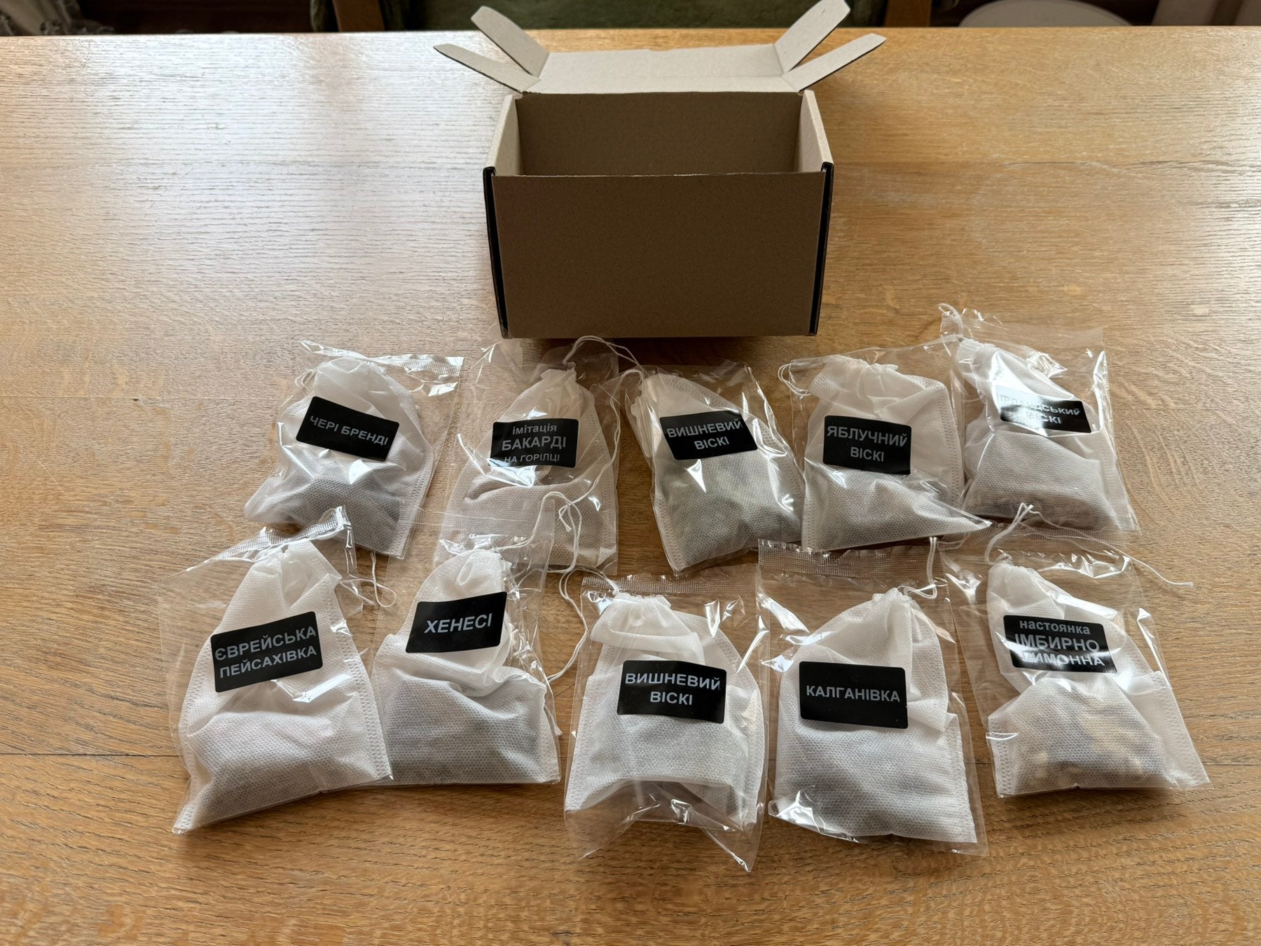 Подарунковий набір із 10 фільтр-пакетів зі спеціями для приготування домашніх настоянок і віскі-стилів. Кожен пакет розрахований на 1 літр алкоголю. Просто залий — і за кілька днів отримаєш 10 різних напоїв.